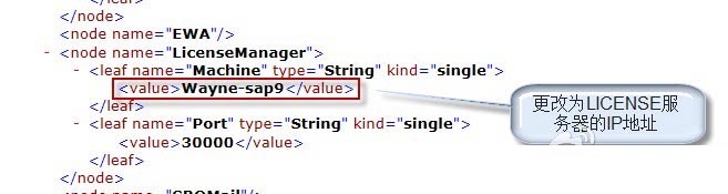 在這兩個文件夾中,都有一個名字叫:b1-local-machine.xml 的文件,用記事本或其它可以編輯XML文件的軟件打開,找到節(jié)點:LicenseManager,把里面的登錄機(jī)器名改為你License服務(wù)器的IP地址,然后保存即可,如下圖所示: