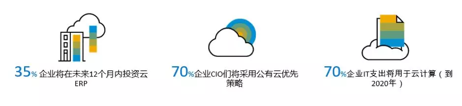 根據(jù)IDC咨詢公司2017年統(tǒng)計(jì),未來(lái)一年內(nèi)全球35%具有規(guī)模性的企業(yè)將開(kāi)始投資云ERP,并且通過(guò)訪談和調(diào)研的形式得出結(jié)論,70%的企業(yè)CIO們會(huì)優(yōu)先考慮公有云解決方案作為IT戰(zhàn)略規(guī)劃。預(yù)測(cè)截至到2020年,全球企業(yè)用于云計(jì)算的支出將占到IT總支出的70%。